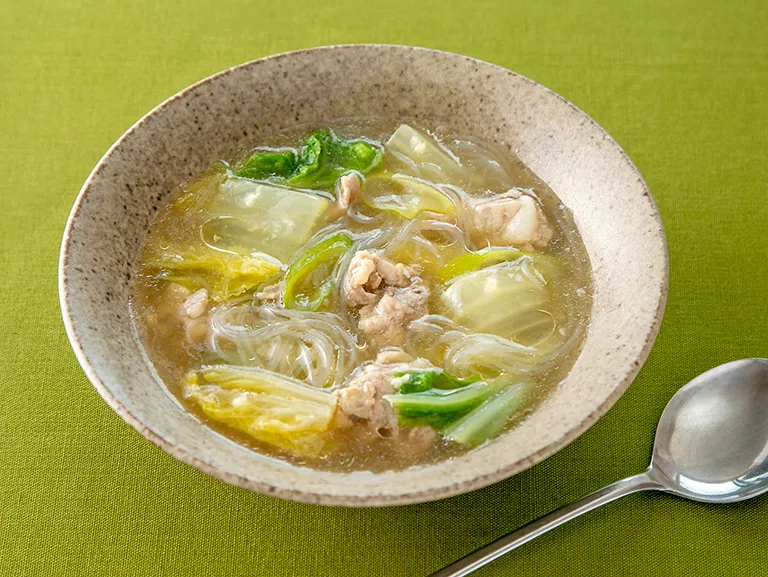 (3) 白菜がくったりとしてきたら、【a】、長ねぎ、春雨を加えて3分ほど煮る。