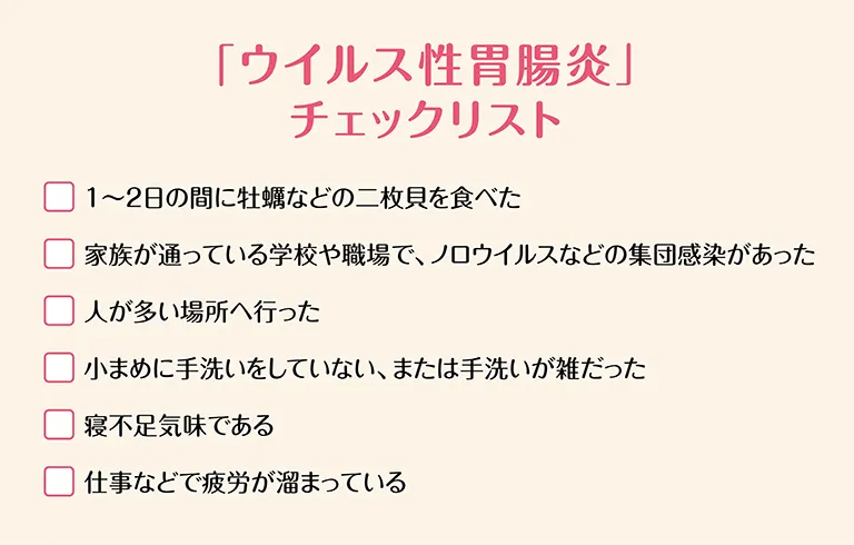 症状が出たときには、次の項目に当てはまるものがないか、セルフチェックをしてみましょう。当てはまるものが多い場合、ウイルス性胃腸炎の疑いがあるかもしれません。