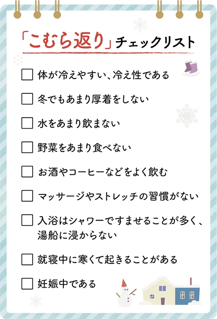 冬は水分をあまり摂らないことから、体内の水分と電解質のバランスが崩れてしまうことも、冬にこむら返りが起こりやすい原因として挙げられます。