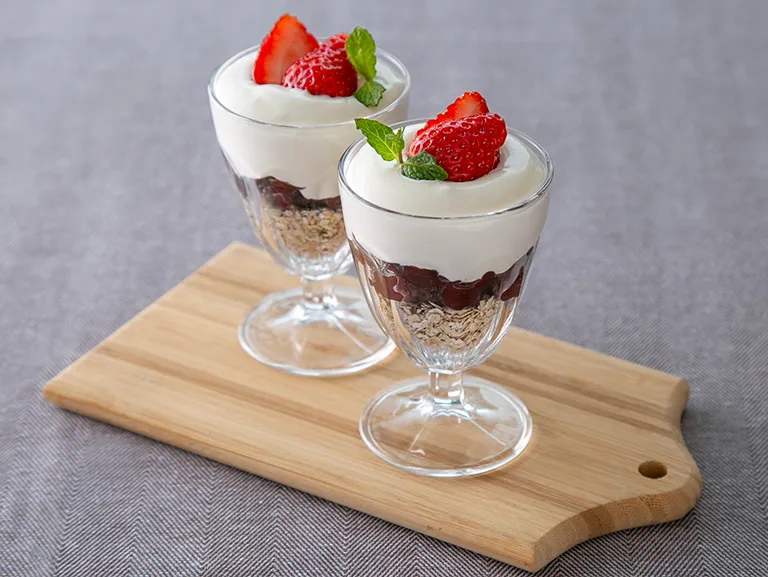 (3)カップにオートミール、あんこ、(2)の順に盛り付け、いちごをトッピングして、ミントを飾る。