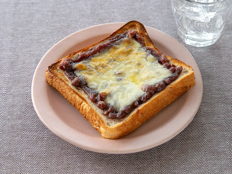 (1)材料を2人分に分け、ライ麦パンにあんこ、ピザ用チーズの順で乗せる。