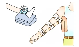 患部を少し動かしただけで痛む場合は、添え木や棒で患部の前後の関節を固定します。たとえば患部が前腕ならば、手首と肘が動かないように固定しましょう。添え木は、真っ直ぐで折れないものなら何でも構いません。