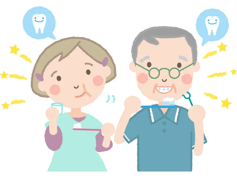 口の健康は全身の健康と関係しています。まずは自分の口の状態を確認してみてください。硬いものでも問題なく食べられるか、食事の際にむせることはないか、食べこぼすことが増えてないか、痛み・腫れ・出血はないか、冷たい物は沁みないかなど、食事をするとき飲み物を飲むときに注意してみましょう。